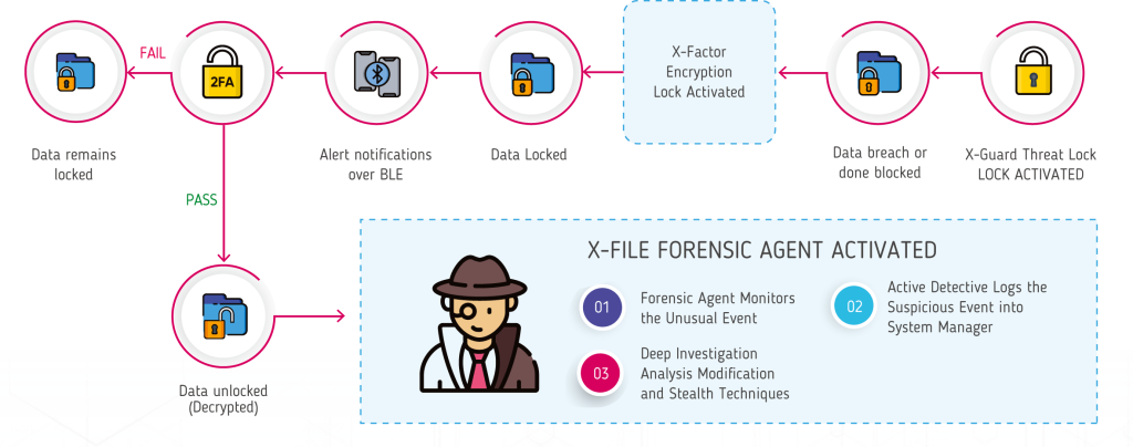 When it is determined that there is an attempt to illegally clone the data, the X-Factor Encryption lock feature responds by triggering data lockdown to prevent the stager from accessing it and activates the Keycode2-factor immediately. X-PHY enters safe mode and asks for a password to complete the 2-factor authentication. At this point, multiple unique keys must be provided to gain access to data. Otherwise, data remains locked preventing malicious cloning. This way, X-PHY combats many attacks involving data theft, including an APT attack.