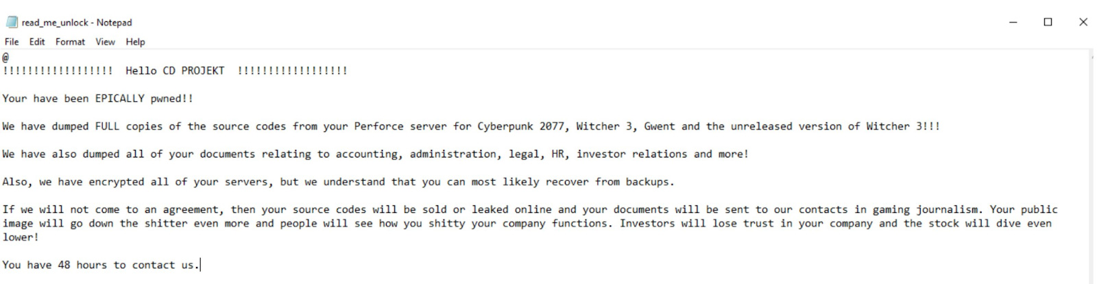 The most well-known attack by HelloKitty was on the systems of CD Projekt Red in February 2021, that claimed to have stolen Cyberpunk 2077, Witcher 3, Gwent, and other games’ source code. It later claimed having sold the sensitive files to another threat actor. Below is the ransom note it left for CD Projekt Red on its encrypted machines: