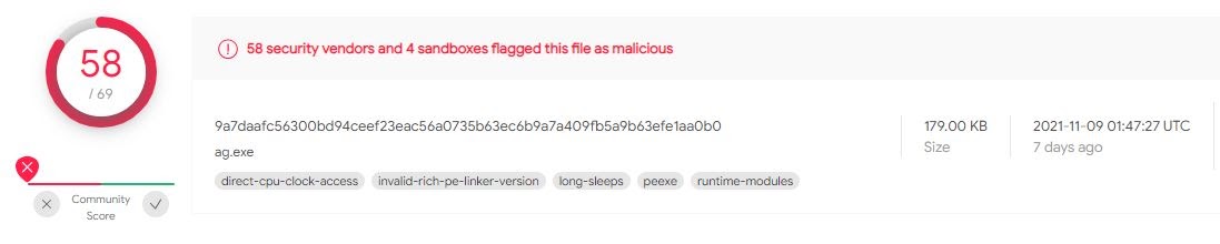 This particular sample was detected as malicious by 58 out of 69 detection tools. It targets Intel 386 or later processors and compatible processors.