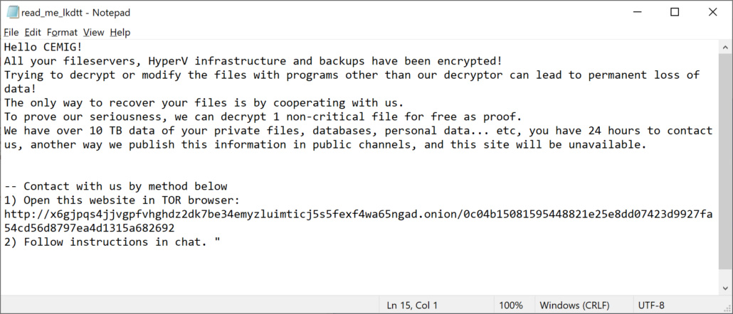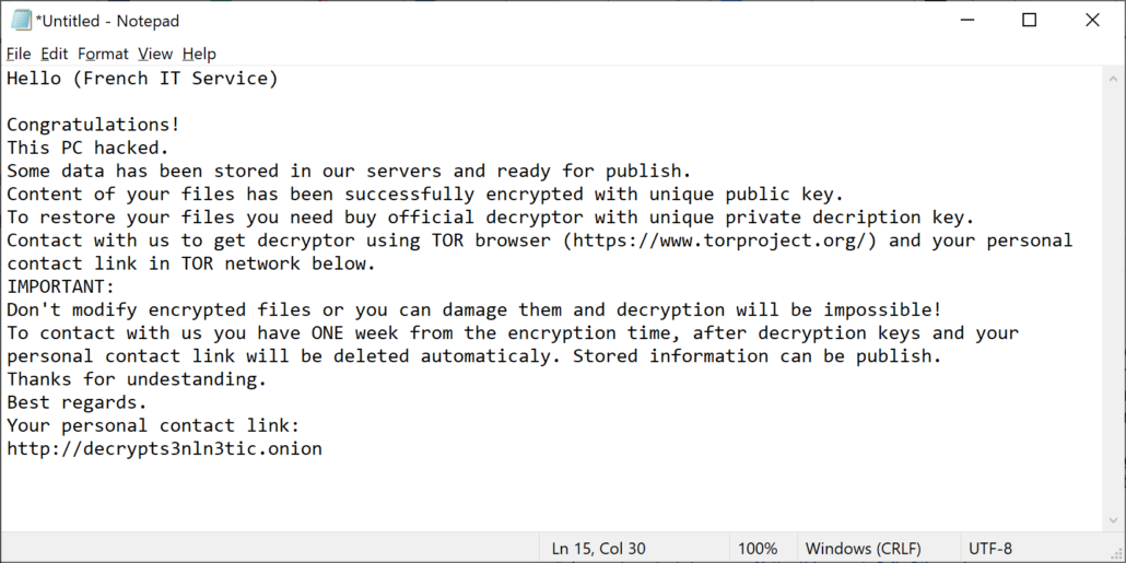 After encryption of files, it leaves a plain text ransom note on the desktop of victim machines. It addresses the victim, demands a ransom amount in BTC and gives further directions or bitcoin address. It usually contains a .onion URL that the victim can open using the Tor browser.