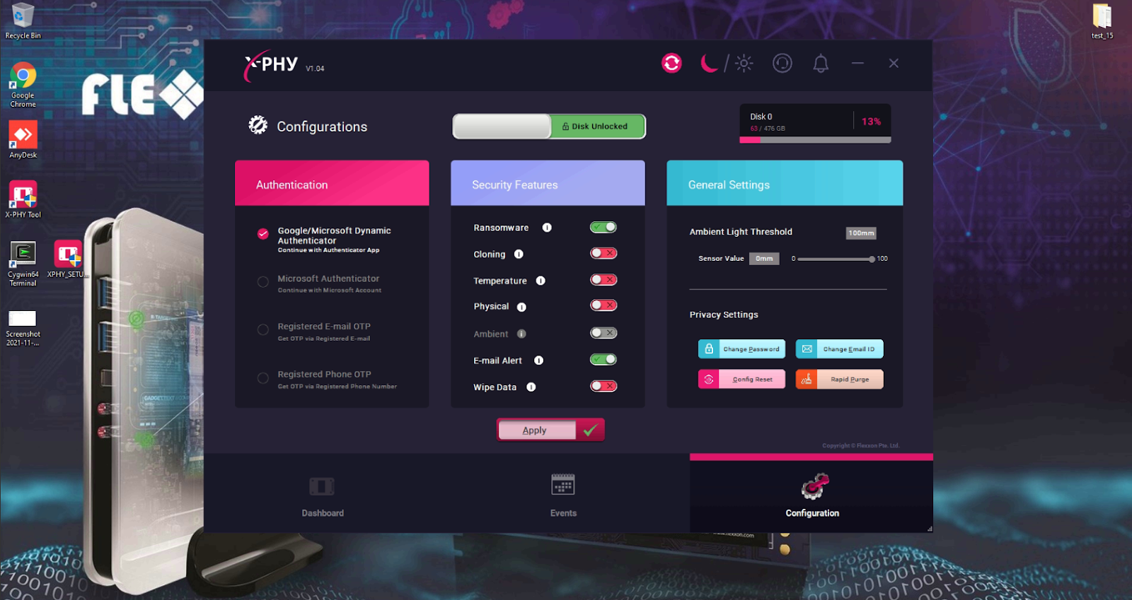 - X-PHY® SSD sends notification to the user in their computer showing that ransomware has been detected. An email notification is also sent to the user simultaneously through the user’s registered email. The user will require OTP to unlock the SSD.