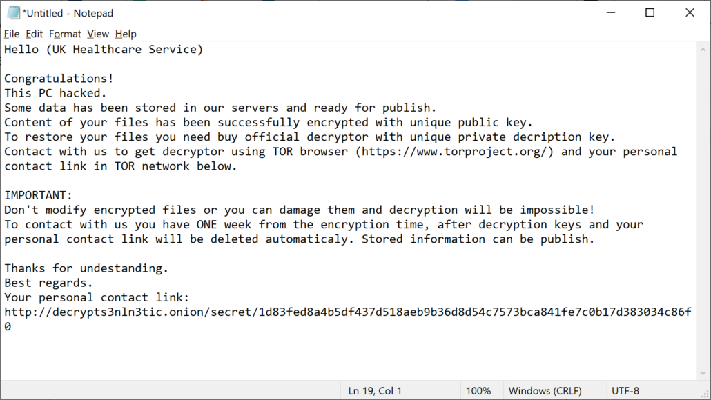 Another HelloKitty attack targeted a UK Healthcare organisation earlier in January 2021. Below is the ransom note found on encrypted computers of the facility. The organization’s name has been omitted.