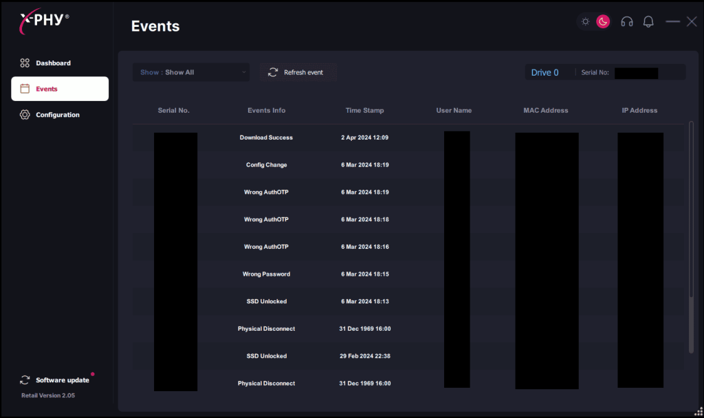 The event page contains the history of events stored in the firmware of the X-PHY®SSD to serve as an audit trail. The event log table contains information such as the Serial Number, Event Info, Time Stamp, Username, MAC address and IP Address.