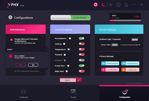 Before running the ransomware with the X-PHY SSD inside the laptop, please check the configuration settings in the X-PHY tool and make sure that the security features are turned on to protect against the ransomware attack. If it’s not enabled, you need to click apply and verify again with the password that you used to log in the X-PHY tool along with the 2FA.